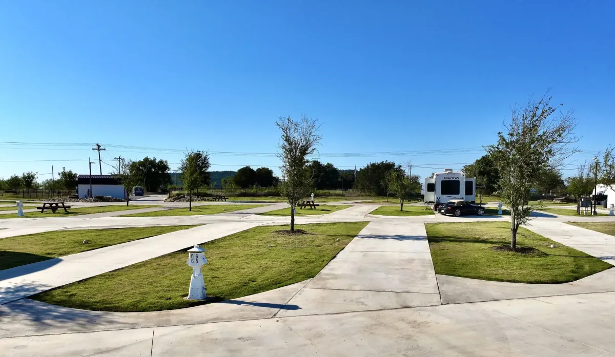 A: Every full hookup site at our Texas RV park includes 30/50 amp electrical service, potable water connection, sewer hookup, concrete parking pad, grassy yard area, daily trash pickup, and free high-speed WiFi. Sites accommodate up to 4 guests and 1 vehicle (additional charges apply for extras)